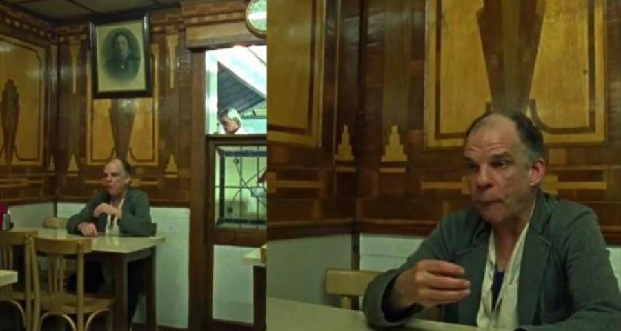 Ο Γάλλος ηθοποιός τρώει καθισμένος στη γωνία μιας ρετρό ταβέρνας, όσο όμως τον πλησιάζει η κάμερα καταλαβαίνουμε ότι στην ουσία στα χέρια του δεν κρατάει απολύτως τίποτα.