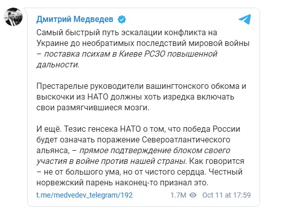 «Η θέση του Γενικού Γραμματέα του ΝΑΤΟ ότι η νίκη της Ρωσίας θα σήμαινε την ήττα της Βορειοατλαντικής Συμμαχίας αποτελεί άμεση επιβεβαίωση της συμμετοχής του μπλοκ (σσ. του ΝΑΤΟ)στον πόλεμο κατά της χώρας μας. Ο τίμιος Νορβηγός τελικά το παραδέχτηκε» έγραψε ο Μεντβέντεφ.