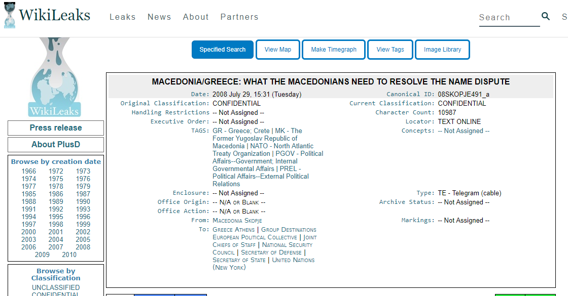 To πρωτο σημείο, μολονότι το λιγότερο σημαντικό, που αποσιωπήθηκε, είναι ότι η «αποκάλυψη των Wikileaks», δεν είναι τωρινή. Χρονολογείται από το 2010-2011, όταν τα Wikileaks διέρρευσαν 251,287 έγγραφα από τις αμερικανικές πρεσβείες σε όλον τον κόσμο. Η διαρροή ονομάστηκε Cablegate και ο τρόπος για να καταλάβει κανείς από ποια διαρροή προέρχεται κάθε έγγραφο βρίσκεται στο ίδιο το όνομα του εγγράφου. Το «αποκαλυπτικό έγγραφο» έχει τίτλο «08SKOPJE491_a». Το _a στο τέλος δείχνει ότι είναι μέρος του Cablegate.
