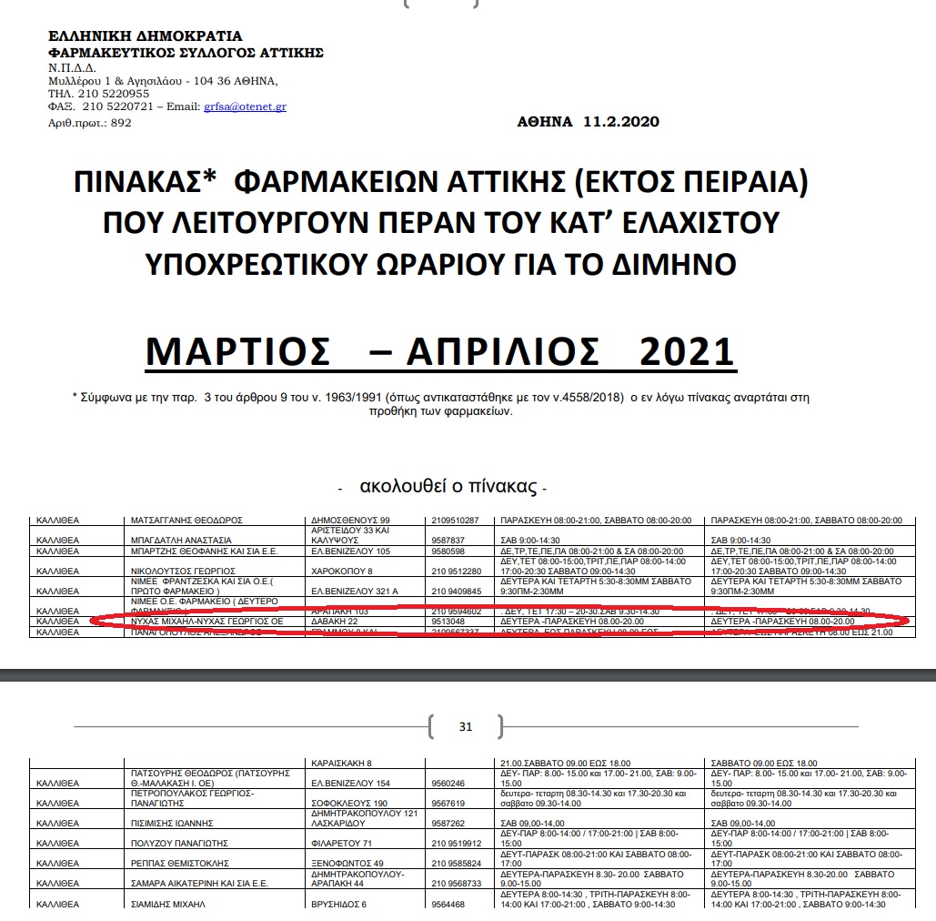 Σύμφωνα με την σχετική λίστα που δημοσιεύει ο Φαρμακευτικός Σύλλογος Αττικής (ΦΣΑ) στην ιστοσελίδα του, για το δίμηνο Μάρτιος – Απρίλιος του 2021, το συγκεκριμένο φαρμακείο έχει δηλώσει ως ωράριο λειτουργίας από Δευτέρα έως Παρασκευή, από τις 8 το πρωί έως τις 20.00 το βράδυ, χωρίς πρόβλεψη για λειτουργία το Σάββατο. Με μία απλή αναζήτηση στη σχετική λίστα, θα διαπιστώσει κανείς πως άλλα φαρμακεία της περιοχής έχουν προνοήσει να δηλώσουν και Σαββατιάτικη λειτουργία των καταστημάτων του. Το ωράριο λειτουργίας των φαρμακείων της Αττικής για το δίμηνο Μαρτίου – Απριλίου δηλώθηκε έως τις 31 Ιανουαρίου, ενώ αξίζει να σημειωθεί πως το συγκεκριμένο φαρμακείο δεν έχει δηλώσει ως ημέρα λειτουργίας το Σάββατο ούτε στη λίστα του ΦΣΑ του προσεχούς διμήνου, Μαΐου – Ιουνίου.