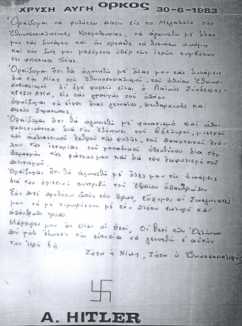 Εθνικοσοσιαλισμού δι΄ εμέ φορεύς είναι ο Λαϊκός Σύνδεσμος ΧΡΥΣΗ ΑΥΓΗ, εις τας γραμμάς του οποίου ορκίζομαι να είμαι ένας γενναίος, πειθαρχικός και πιστός Στρατιώτης.