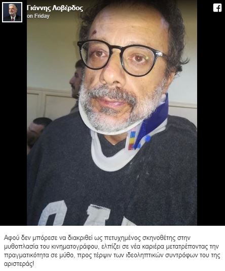 «Αφού δεν μπόρεσε να διακριθεί ως πετυχημένος σκηνοθέτης στην μυθοπλασία του κινηματογράφου, ελπίζει σε νέα καριέρα μετατρέποντας την πραγματικότητα σε μύθο, προς τέρψιν των ιδεοληπτικών συντρόφων του της αριστεράς!» ανέφερε ο βουλευτής και πρώην σχολιαστής του Blue Sky, Γιάννης Λοβέρδος, επικροτώντας την αστυνομική βιαιότητα που υπέστη ο σκηνοθέτης.
