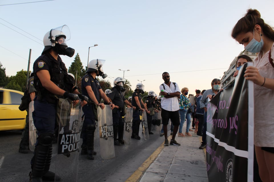 Πολλοί άνδρες των ΜΑΤ βρέθηκαν στο σημείο και περικύκλωσαν τη διαδήλωση την οποία πλαισίωσαν εκατοντάδες άνθρωποι από τον χώρο του πολιτισμού. Το πλήθος βρέθηκε πλησίον του πεζοδρομίου της πλατείας Συντάγματος, καθώς όπως φαίνεται υπήρχε εντολή να μην διαδηλώσουν σε όλο το μήκος και πλάτος του δρόμου.
