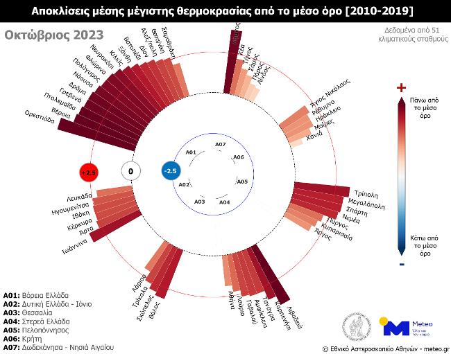 Ο φετινός Οκτώβριος χαρακτηρίστηκε από πολλές ημέρες με θετικές αποκλίσεις θερμοκρασίας, και εκτός από τις Κυκλάδες, τα Δωδεκάνησα, και την Κρήτη, ήταν ο πιο θερμός Οκτώβριος από το 2010. Στη Μακεδονία και τη Θράκη καταγράφηκαν οι μεγαλύτερες θετικές αποκλίσεις θερμοκρασίας, με τις μέσες μηνιαίες τιμές να κυμαίνονται 3,5 °C πάνω από τα κανονικά για την εποχή επίπεδα. Εξαιρετικά θερμός ήταν και για τη Θεσσαλία (+2,8 °C), τη Στερεά Ελλάδα, την Ήπειρο, τα Επτάνησα, τη Δυτική Ελλάδα και την Πελοπόννησο (+2,7 °C), αναφέρει το meteo.