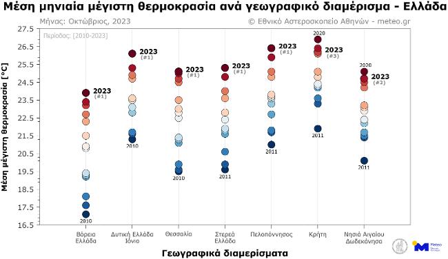 Το επόμενο γράφημα παρουσιάζει την κατάταξη του μήνα Οκτωβρίου ανά έτος, ανάλογα με τη μέση μηνιαία τιμή της μέγιστης θερμοκρασίας. Για τα Νησιά του Αιγαίου και τα Δωδεκάνησα ήταν ο 2ος πιο θερμός μήνας τα τελευταία 15 χρόνια, και για την Κρήτη ο 3ος πιο θερμός. Το τελευταίο δεκαήμερο του μήνα εκδηλώθηκαν οι μεγαλύτερες θετικές αποκλίσεις θερμοκρασίας, της τάξης των 6-9 °C.
