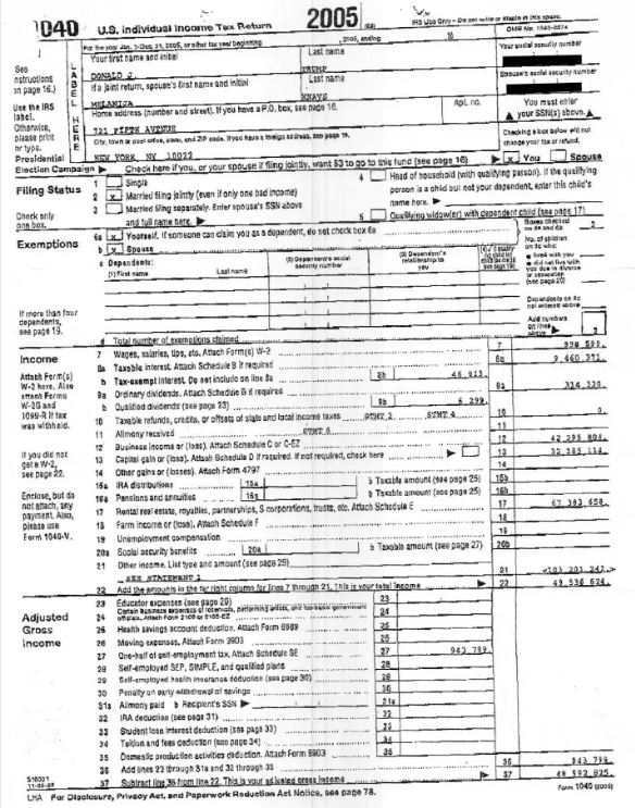 Η δημοσιοποίηση των δύο κύριων σελίδων της δήλωσής του 2005 πραγματοποιήθηκε από το δίκτυο MSNBC, αφορά τα ποσά που δήλωσε το ζεύγος Τραμπ και δείχνει ότι κατεβλήθη ομοσπονδιακός φόρος εισοδήματος περίπου 38 εκατομμυρίων δολαρίων (36,5 εκατ., σύμφωνα με έναν άλλον υπολογισμό), για εισόδημα λίγο μεγαλύτερο των 150 εκατομμυρίων. Το έγγραφο αποκαλύφθηκε από τον ανεξάρτητο δημοσιογράφο Ντέιβιντ Κέι Τζόνστον, ο οποίος λέει ότι το έλαβε στο σπίτι του. Ο ίδιος είναι επίσης ο συγγραφέας ενός βιβλίου για τον Τραμπ.