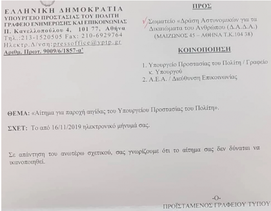«Σε απάντηση του ανωτέρω σχετικού, σας γνωρίζουμε ότι το αίτημα σας δεν δύναται να ικανοποιηθεί» απάντησε χαρακτηριστικά το Υπουργείο Προστασίας του Πολίτη, χωρίς να δίνει κάποια αιτιολογία για την απόρριψη.