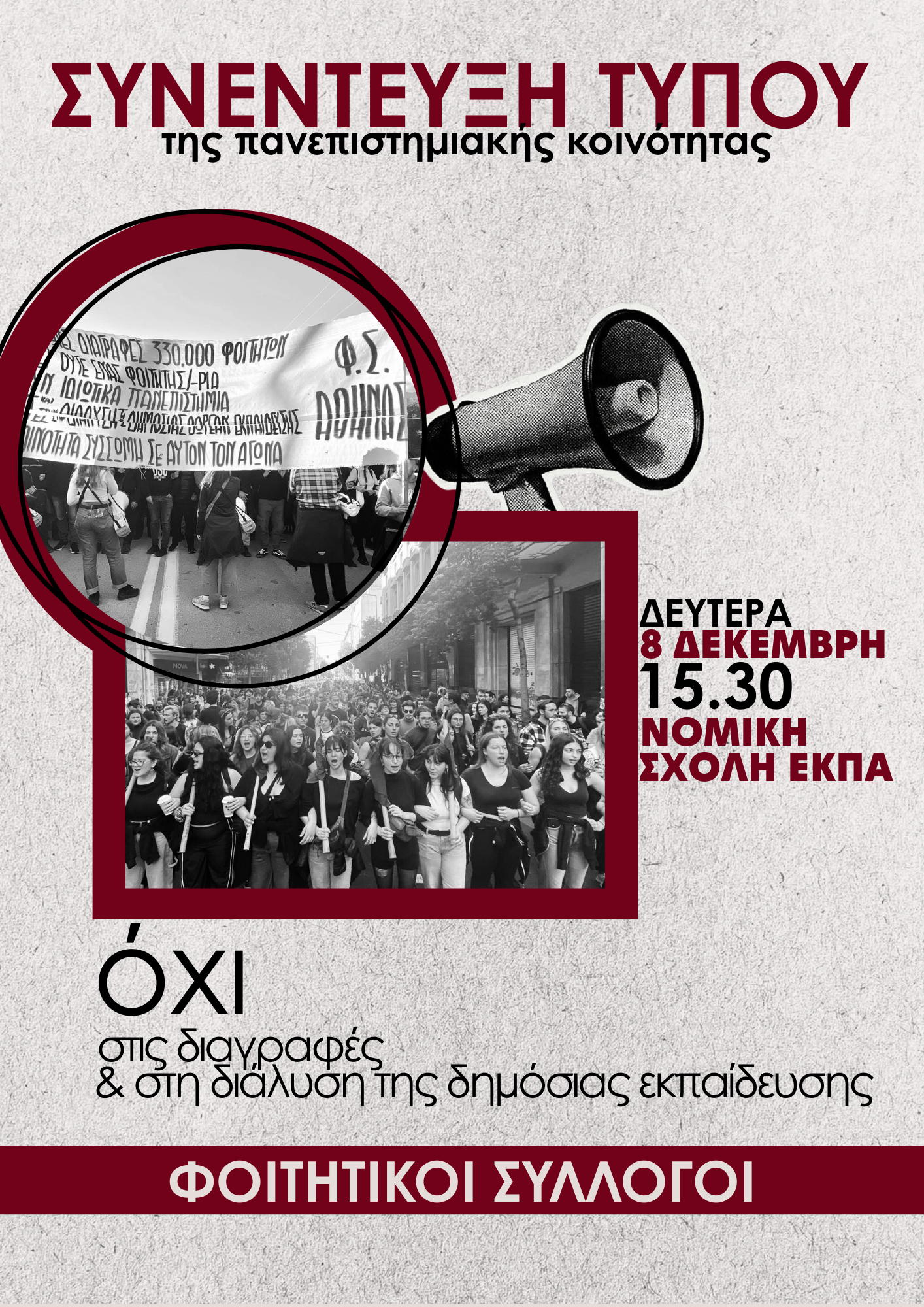 «Οι Φοιτητικοί Σύλλογοι προχωράμε την Δευτέρα 8 Δεκεμβρίου στη Νομική στις 15.30, σε συνέντευξη τύπου με την ΠΟΣΔΕΠ και καλούμε συλλογικούς φορείς του Πανεπιστημίου, όλη την ακαδημαϊκή κοινότητα να συμμετάσχει σε αυτή. Καλούμε δημοσιογράφους και μέσα ενημέρωσης να έρθουν, να συμμετάσχουν με ερωτήσεις στη συνέντευξη και να την αναμεταδώσουν.