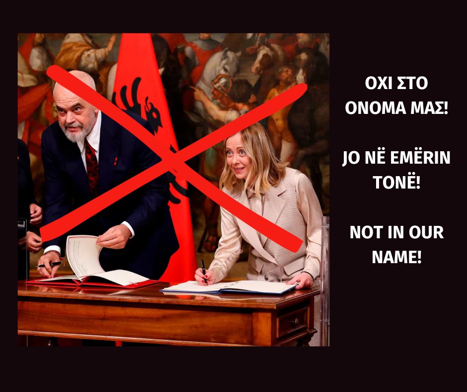 Με μεγάλη απογοήτευση, πίκρα, οργή και άλλα αρνητικά συναισθήματα μας γέμισε η πρόσφατη συμφωνία μεταξύ του πρωθυπουργού της Αλβανίας Έντι Ράμα και της Ιταλίδας ομολόγου του Τζόρτζια Μελόνι για τη δημιουργία στην Αλβανία καμπ μεταναστών και προσφύγων που κατευθύνονται στην Ιταλία. Η συμφωνία προβλέπει τη δημιουργία “δομών φιλοξενίας” μέγιστης χωρητικότητας 3000 ατόμων με στόχο να περνάνε από αυτά μέχρι και 36000 άτομα το χρόνο. Με το παρόν κείμενο, ως άτομα μεταναστευτικής καταγωγής που ζούμε στην Ελλάδα, δηλώνουμε την πλήρη αντίθεσή μας σε αυτή την επαίσχυντη συμφωνία.
