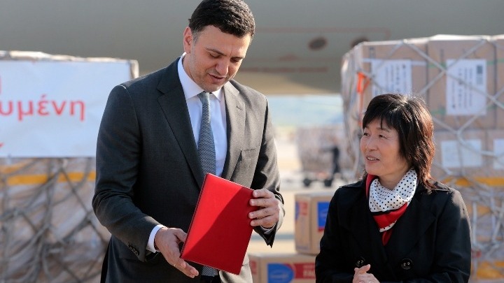 Το υγειονομικό υλικό παρέδωσε, εκ μέρους της κινεζικής κυβέρνησης, η πρεσβευτής της Κίνας στην Ελλάδα, Τσανγκ Τσιγιουέ, στους υπουργούς Επικρατείας Γιώργο Γεραπετρίτη, Υγείας Βασίλη Κικίλια, τον αναπληρωτή υπουργό Εξωτερικών Μιλτιάδη Βαρβιτσιώτη και τον γενικό γραμματέα Διεθνών Οικονομικών Σχέσεων και Εξωστρέφειας του ΥΠΕΞ Γρηγόρη Δημητριάδη. Στην ίδια πτήση, σύμφωνα με την ίδια ενημέρωση, έφθασαν και άλλα χαρτοκιβώτια ιατρικών προμηθειών, βάρους περίπου 10 τόνων, δωρεά από κινεζικές επιχειρήσεις και οργανώσεις.