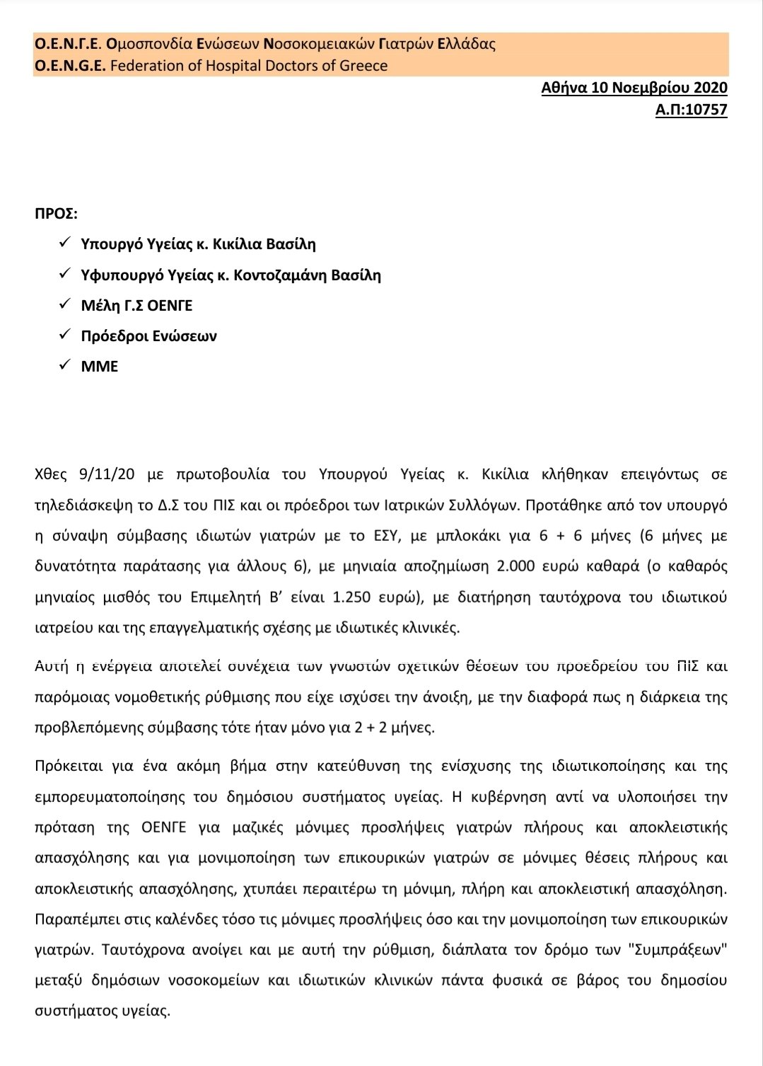 Όπως προσθέτει στη συνέχεια, η «απασχόληση των ιδιωτών γιατρών θα γίνει με συγκεκριμένους όρους οι οποίοι είναι οι εξής: