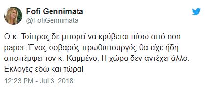 «Ο κ. Tσίπρας δεν μπορεί να κρύβεται πίσω από non paper. Ένας σοβαρός πρωθυπουργός θα είχε ήδη αποπέμψει τον κ. Καμμένο. Η χώρα δεν αντέχει άλλο. Εκλογές εδώ και τώρα», αναφέρει η Γεννηματά.