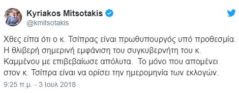 Ο αρχηγός της αξιωματικής αντιπολίτευσης, Κυριάκος Μητσοτάκης, υποστήριξε μέσω του προσωπικού του λογαρισμού στο Twitter ότι «χθες είπα ότι ο κ. Τσίπρας είναι πρωθυπουργός υπό προθεσμία. Η θλιβερή σημερινή εμφάνιση του συγκυβερνήτη του κ. Καμμένου με επιβεβαίωσε απόλυτα», και πρόσθεσε πως «το μόνο που απομένει στον κ. Τσίπρα είναι να ορίσει την ημερομηνία των εκλογών».