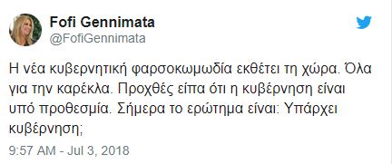 Η επικεφαλής του Κινήματος Αλλαγής, Φώφη Γεννηματά, σημείωσε μέσω του προσωπικού της λογαριασμού στο Twitter ότι «η νέα κυβερνητική φαρσοκωμωδία εκθέτει τη χώρα. Όλα για την καρέκλα. Προχθές είπα ότι η κυβέρνηση είναι υπό προθεσμία. Σήμερα το ερώτημα είναι: Yπάρχει κυβέρνηση;»