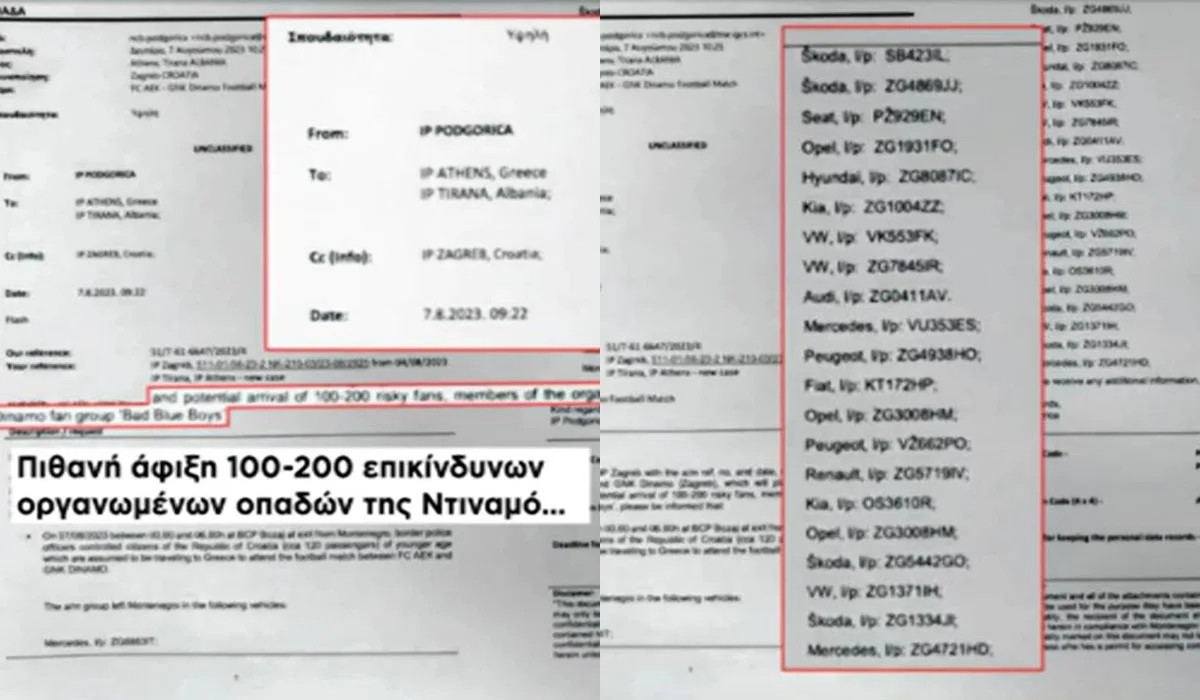 Το σχετικό έγγραφο έφτασε στα γραφεία της ΕΛ.ΑΣ. στις 09:22 το πρωί της χθεσινής ημέρας, καθώς υπήρχε η επισήμανση ότι περίπου 120 άτομα, τα οποία χαρακτηρίζονται ως «επικίνδυνοι οπαδοί» πέρασαν από τα σύνορα με πιθανό προορισμό την Αθήνα για το παιχνίδι της ΑΕΚ με τη Ντιναμό Ζάγκρεμπ. Μάλιστα, στα άτομα αυτά έγιναν έλεγχοι και στο έγγραφο υπάρχουν οι αριθμοί των πινακίδων κυκλοφορίας των αυτοκινήτων που πέρασαν τα σύνορα στο Μαυροβούνιο, όπως ο τύπος των οχημάτων και οι μάρκες τους.