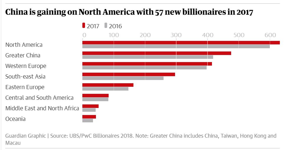 Όπως δείχνει και το σχετικό γράφημα του Guardian, οι περισσότεροι από τους δισεκατομμυριούχους βρίσκονται τις ΗΠΑ, ωστόσο η ταχύτερη αύξηση παρατηρείται στην Κίνα,. Μάλιστα εκεί, μέσα σε 12 χρόνια, ο αριθμός των δισεκατομμυριούχων αυξήθηκε από τους 16 στους 373.