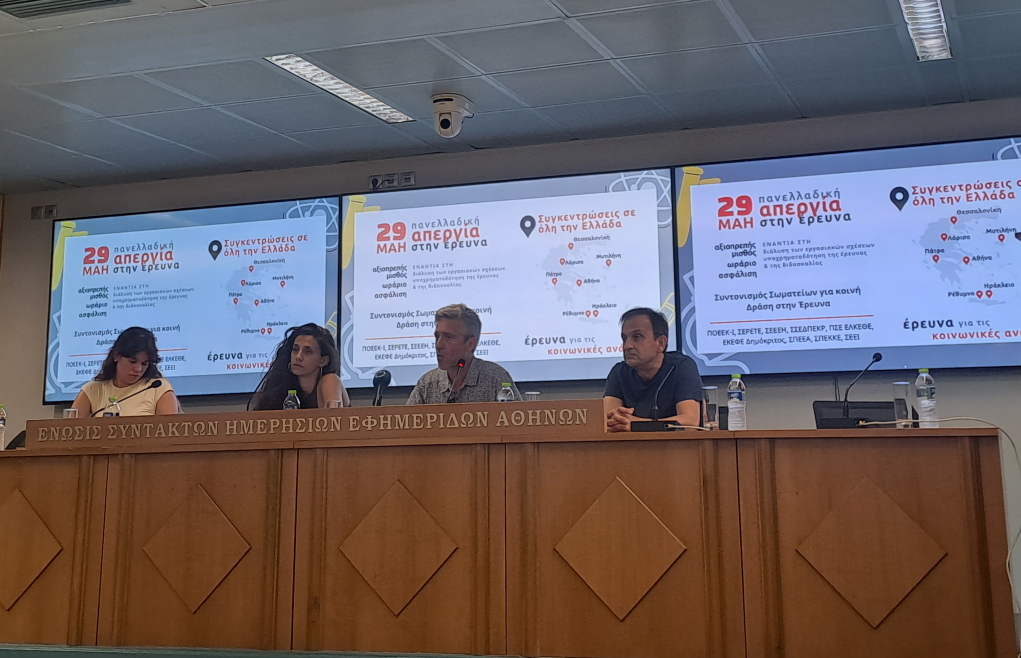 Με αυτή τη διαπίστωση ξεκίνησε και η συνέντευξη Τύπου, με τον Δημήτρη Κάσση, μέλος του Γενικού Συμβουλίου της Πανελλήνιας Ομοσπονδίας Εργαζομένων σε Ερευνητικά Κέντρα και Ιδρύματα. «Ουσιαστικά είναι μια ωραία μέρα για την έρευνα σήμερα, γιατί πραγματικά έγινε ένας όμορφος συντονισμός, μια κουβέντα, ένας κοινός βηματισμός πολλών σωματείων δευτεροβάθμιων, κλαδικών, πρωτοβάθμιων, επιχειρησιακών» αναγνώρισε, συμπληρώνοντας ότι ένα από τα προβλήματα της έρευνας είναι ότι σε επίπεδο συνδικαλιστικό δεν υπάρχει επαρκής επικοινωνία, καθώς είναι ένας τεράστιος χώρος που εκτείνεται σε πολλά διαφορετικά ερευνητικά κέντρα και σε πανεπιστήμια.