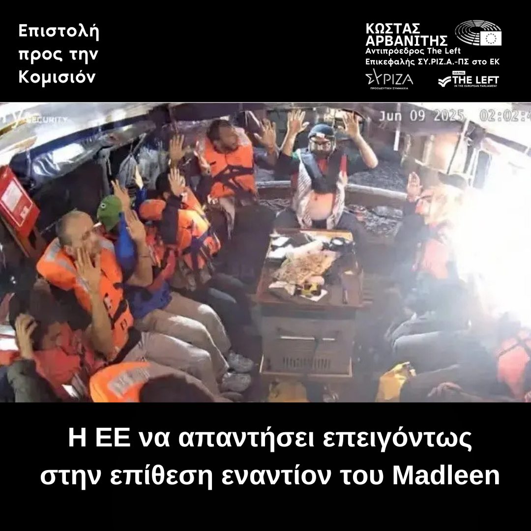 Με επιστολή προς την πρόεδρο της Ευρωπαϊκής Επιτροπής Ούρσουλα φον ντερ Λάιεν, την ύπατη εκπρόσωπο Εξωτερικών Υποθέσεων Κάγια Κάλας, καθώς και τους αρμόδιους επιτρόπους και ευρωβουλευτές, οι ευρωβουλευτές της Αριστεράς ζητούν την άμεση ανάληψη δράσης για την πρόσφατη στρατιωτική επίθεση των ισραηλινών δυνάμεων ασφαλείας κατά του πλοίου Madleen και του άοπλου πληρώματός του.
