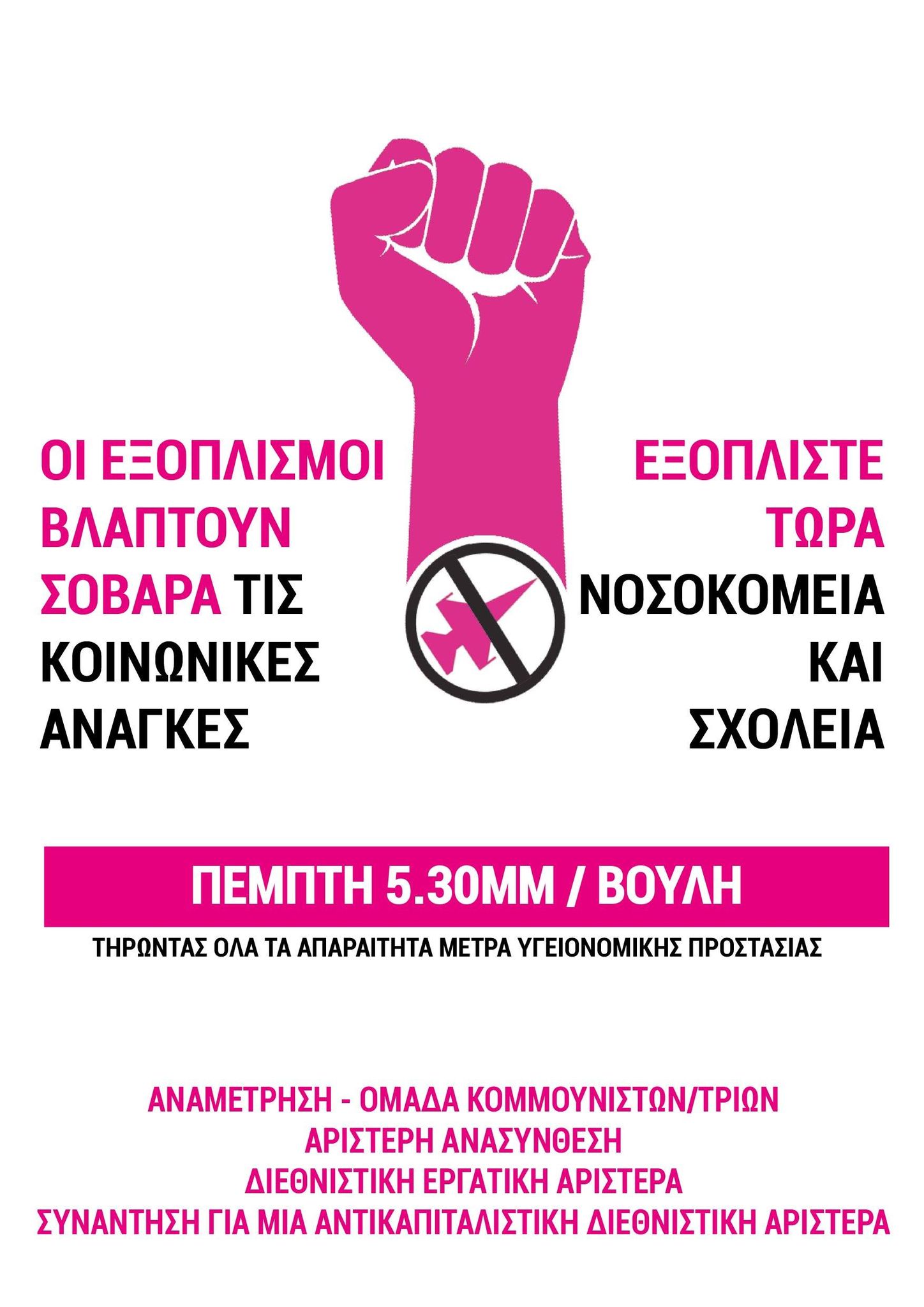 Για να σταματήσει αυτή η τρέλα και να μπει στοπ στις πολεμικές προετοιμασίες είναι απαραίτητο να μη δοθεί ούτε ένα ευρώ σε νέα όπλα, σε πανακριβά πολεμικά αεροσκάφη και φρεγάτες. Να εξοπλίσουμε τα νοσοκομεία και τα σχολεία και όχι το στρατό.