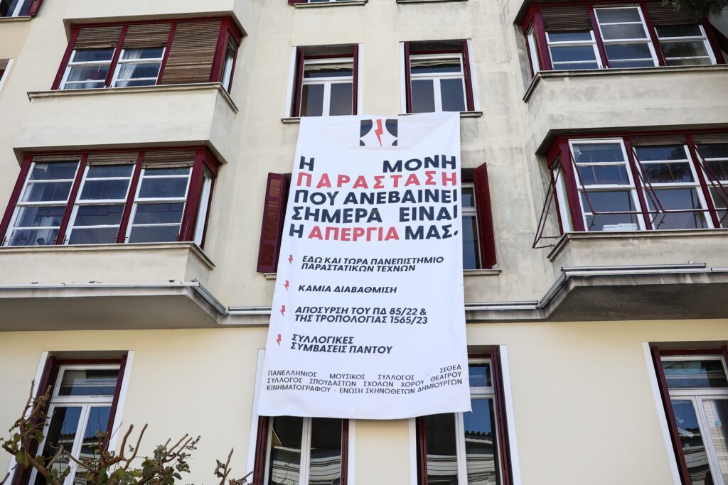 Τα θέατρα μένουν κλειστά. Το Εθνικό Θέατρο, το Κρατικό Θέατρο Βορείου Ελλάδος (Τσίλλερ και Ρεξ), το Δημοτικό Θέατρο Πατρών τελούν υπό κατάληψη. Οι καθηγητές του Εθνικού και του ΚΘΒΕ υπέβαλαν την παραίτησή τους (ΚΑΙ από τη νέα σύμβαση που θα ερχόταν). Καθημερινά οι σπουδαστές καλλιτεχνικών σχολών γεμίζουν τους δρόμους με δράσεις τους. Περφόρμανς, συναυλίες, συγκεντρώσεις, βουβές διαμαρτυρίες, πορείες προς το υπουργείο Πολιτισμού…