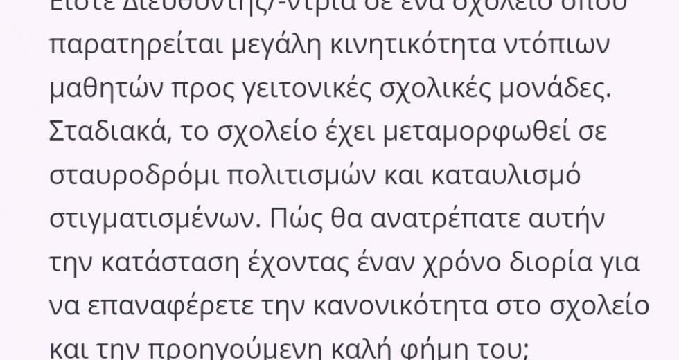 «Είστε Διευθυντής/-ντρια σε ένα σχολείο όπου παρατηρείται μεγάλη κινητικότητα ντόπιων μαθητών προς γειτονικές σχολικές μονάδες. Σταδιακά, το σχολείο έχει μεταμορφωθεί σε σταυροδρόμι πολιτισμών και καταυλισμό στιγματισμένων. Πώς θα ανατρέπατε αυτήν την κατάσταση έχοντας έναν χρόνο διορία για να επαναφέρετε την κανονικότητα στο σχολείο και την προηγούμενη καλή φήμη του;» αναφέρει ένα ερώτημα: