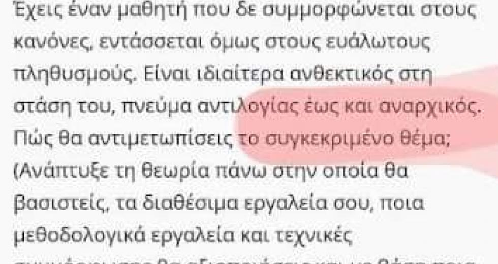 Ενώ στους χιλιάδες νεοδιόριστους τίθεται και το ερώτημα τι θα έκαναν απέναντι σε μαθητή που «δεν συμμορφώνεται στους κανόνες» είναι στους ευάλωτους πληθυσμούς, αλλά «ιδιαίτερα ανθεκτικός στη στάση του, πνεύμα αντιλόγίας, έως και αναρχικός».