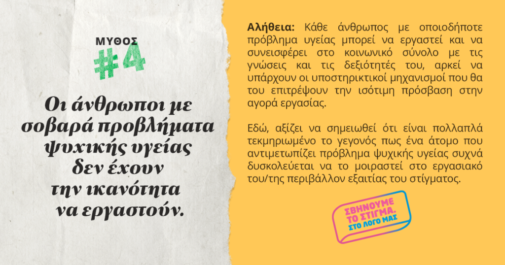 «Το λέμε και στους μύθους και αλήθειες που έχουμε στο πρόγραμμα μας, ότι υπάρχει ένας μύθος πως οι άνθρωποι με προβλήματα ψυχικής υγείας δε μπορούν να εργαστούν. Βεβαίως και μπορούν να εργαστούν όλοι οι άνθρωποι και χρειάζεται το κατάλληλο εργασιακό πλαίσιο. Επίσης είναι πάρα πολύ συχνό το φαινόμενο οι άνθρωποι να φοβούνται να μιλήσουν στη δουλειά τους για τα προβλήματα ψυχικής υγείας που πιθανά να αντιμετωπίζουν, τόσο γιατί μπορεί να μην προσληφθούν ή γιατί μπορεί να τους βλέπουν μετά με έναν απορριπτικό τρόπο, ή με έναν τρόπο φόβου» υπογράμμισε η Π. Φίτσιου κι εξήγησε: «Θα σας πω ότι στο πλαίσιο της έρευνας με focus group που κάναμε στο έργο μας, κάναμε δύο έρευνες. Η μία αφορούσε τον τύπο, να δούμε πώς αποτυπώνεται η ψυχική υγεία και η ψυχική ασθένεια στον δημόσιο λόγο, στα ΜΜΕ μάλλον, και κάναμε και μία έρευνα με focus group με ανθρώπους  που βιώνουν προβλήματα ψυχικής υγείας.  Μας είπανε πολλοί λοιπόν ότι “όταν έμαθαν στην δουλειά μου για το πρόβλημα της υγείας μου, άρχισαν να μου λένε για αστείο δήθεν “ααα, να προσέχουμε”. Λες και οπωσδήποτε ένας άνθρωπος με προβλήματα ψυχικής υγείας δυνητικά μπορεί να προκαλέσει κάποια προβλήματα».