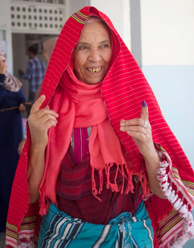 Γυναίκα που μόλις ψήφισε στις πρώτες ελεύθερες προεδρικές εκλογές στην Τυνησία τον Νοέμβριο του 2014. Για αποφυγή νοθείας, οι ψηφοφόροι μόλις ψηφίσουν βουτάνε το δάχτυλό τους στο μελάνι -ένα αμφιλεγόμενο μέτρο που εφαρμόζεται σε αναπτυσσόμενες χώρες. Photo: Jenny Tsiropoulou