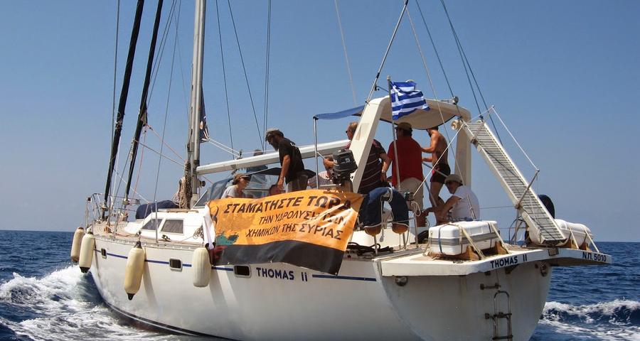 Στο λιμάνι της Παλαιόχωρας επέστρεψαν δύο ώρες μετά τα μεσάνυχτα, τα δύο ιστιοφόρα ανοικτής θάλασσας που έλαβαν μέρος στην εν πλω διαμαρτυρία ενάντια στην υδρόλυση των χημικών της Συρίας στο θαλάσσιο χώρο της Μεσογείου