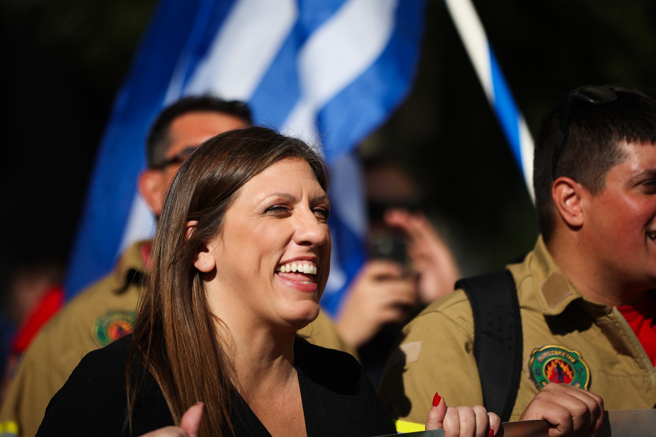 Η πρόεδρος της Πλεύσης Ελευθερίας, Ζωή Κωνσταντοπούλου, συμμετείχε στην πορεία με το μπλοκ των εποχικών πυροσβεστών.