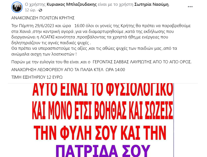 «Την Πέμπτη 29/6/2023 και ώρα 16:00 όλοι οι γονείς της Κρήτης θα πρέπει να παραβρεθούμε στα Χανιά, στην κεντρική αγορά ,για να διαμαρτυρηθούμε ,κατά της εκδήλωσης που διοργανώνει η ΛΟΑΤΚΙ κοινότητα ,προσβάλοντας τα χρηστά ήθη,με ενέργειες που δηλητηριάζουν τις αγνές παιδικές ψυχές .