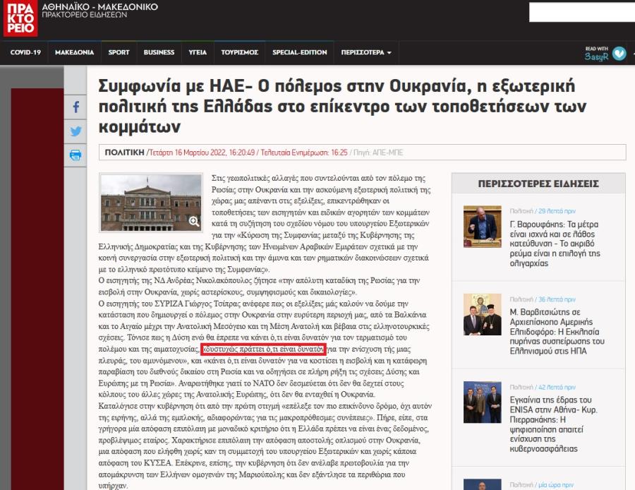 «Στην ομιλία μου ως εισηγητής για τη συμφωνία Ελλάδας-ΗΑΕ στη Βουλή ανέφερα επί λέξει: Η Δύση “κάνει ό,τι είναι δυνατόν για την ενίσχυση της μιας πλευράς, του αμυνόμενου. Κάνει ό,τι είναι δυνατόν για να κοστίσει η εισβολή και η κατάφωρη παραβίαση του διεθνούς δικαίου στη Ρωσία. Κάνει ό,τι είναι δυνατόν για την πλήρη ρήξη των σχέσεων Δύσης -και ειδικά της Ευρώπης- με τη Ρωσία. Αλλά δεν κάνει ό,τι είναι δυνατόν για τον τερματισμό του πολέμου και της εισβολής”. Ο συντάκτης του ΑΠΕ πρόσθεσε απλώς μια λεξούλα, το “δυστυχώς”. “Δυστυχώς πράττει ό,τι είναι δυνατόν για την ενίσχυση της μιας πλευράς, του αμυνόμενου κλπ κλπ”. Στο σχετικό βίντεο το «δυστυχώς» δεν υπάρχει. Στα πρακτικά της Βουλής δεν υπάρχει. Δεν πρόκειται για αναγραμματισμό, για παράλειψη λέξης, για λαθάκι. Πρόκειται ξεκάθαρα για σκόπιμη, συνειδητή διαστρέβλωση που αντιστρέφει την ουσία όσων υποστήριξε βουλευτής του ελληνικού κοινοβουλίου ως εισηγητής κατά τη συζήτηση της συγκεκριμένης Συμφωνίας» τονίζει ο Γιώργος Τσίπρας και προσθέτει: «Ότι το ΑΠΕ και η ιστορία του θα στιγματιζόταν από τη στιγμή που το ανέλαβε υπό την εποπτεία του ο εντιμότατος κ. Μητσοτάκης ήταν αναμενόμενο. Ότι θα έπεφτε τόσο χαμηλά, σε τέτοια αθλιότητα, δεν ήταν αναμενόμενο. Απαιτώ από το ΑΠΕ την άμεση αναγνώριση της σκόπιμης διαστρέβλωσης και την παραίτηση των υπευθύνων».