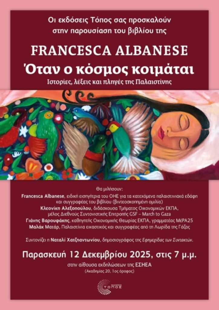 – Francesca Albanese, ειδική εισηγήτρια του ΟΗΕ για τα κατεχόμενα παλαιστινιακά εδάφη (βιντεοσκοπημένη ομιλία)