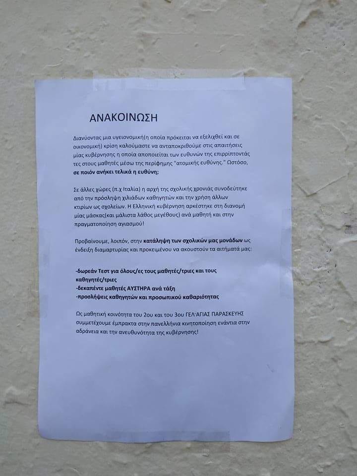 Την ίδια ώρα, απέναντι στις μαζικές καταλήψεις σε σχολεία της Θεσσαλονίκης για τα ανεπαρκή μέτρα προστασίας της κυβέρνησης, η εισαγγελέας ανηλίκων, Δήμητρα Τσιαρδακλή, παρήγγειλε από την αστυνομία να σχηματιστεί δικογραφία για διατάραξη λειτουργίας δημόσιας υπηρεσίας, ενώ στο Ηράκλειο η αστυνομία ζητάει από δύο τουλάχιστον διευθυντές σχολείων να κατονομάσουν τα ονόματα μαθητών που συμμετέχουν σε καταλήψεις.