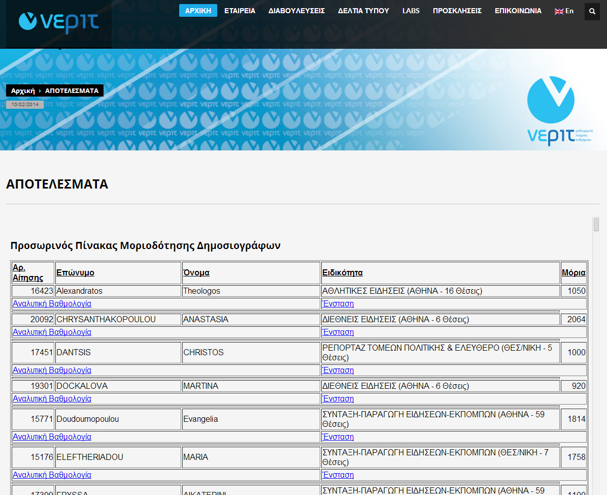 Στην σημερινή ανακοίνωση της ΝΕΡΙΤ που ήρθε μετά την δημοσίευση στο διαδίκτυο της λίστας μοριοδότησης από το ThePressProject διαβάζουμε ότι «ο πίνακας που δημοσιεύουν διάφορα ιστολόγια καταρτίσθηκε μηχανογραφικά, βάσει των δηλωθέντων από τους υποψηφίους προσόντων, και εγκαταστάθηκε σε δοκιμαστικό περιβάλλον. Η δε δημοσιοποίησή του είναι προϊόν προσπέλασης στο δοκιμαστικό περιβάλλον από μη εξουσιοδοτημένους τρίτους».