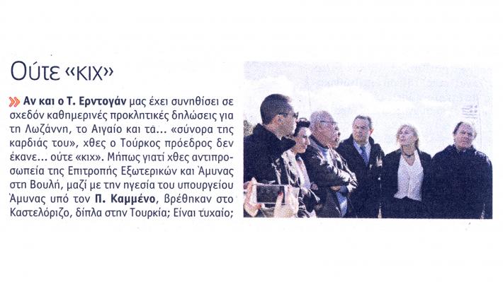 Το γεγονός ότι ο Ερντογάν δεν έβγαλε «ούτε κιχ» επειδή στο Καστελόριζο πήγαν ο Καμμένος, ο Βίτσας και ο Κασιδιάρης μόνο ως αστείο θα μπορούσε να το λάβει κανείς. Αλλά η πολιτική και θεσμική αναγνώριση της Χρυσής Αυγής δεν είναι αστείο. Είναι σφάλμα σοβαρό κι επικίνδυνο.