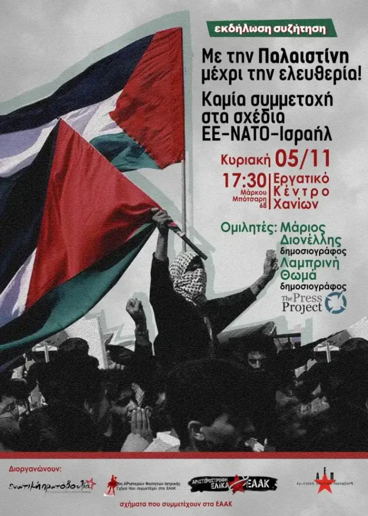 Το απόγευμα θα πραγματοποιηθεί εκδήλωση – συζήτηση από τα σχήματα ΕΑΑΚ Ενωτική Πρωτοβουλία, Κίνηση Αριστερών Φοιτητών Ιατρικής, Αριστερόστροφη Έλικα και Αριστερή Ενωτική Παρέμβαση με θέμα «Με την Παλαιστίνη μέχρι την ελευθερία! Καμία συμμετοχή στα σχέδια ΕΕ-ΝΑΤΟ-ΙΣΡΑΗΛ!».