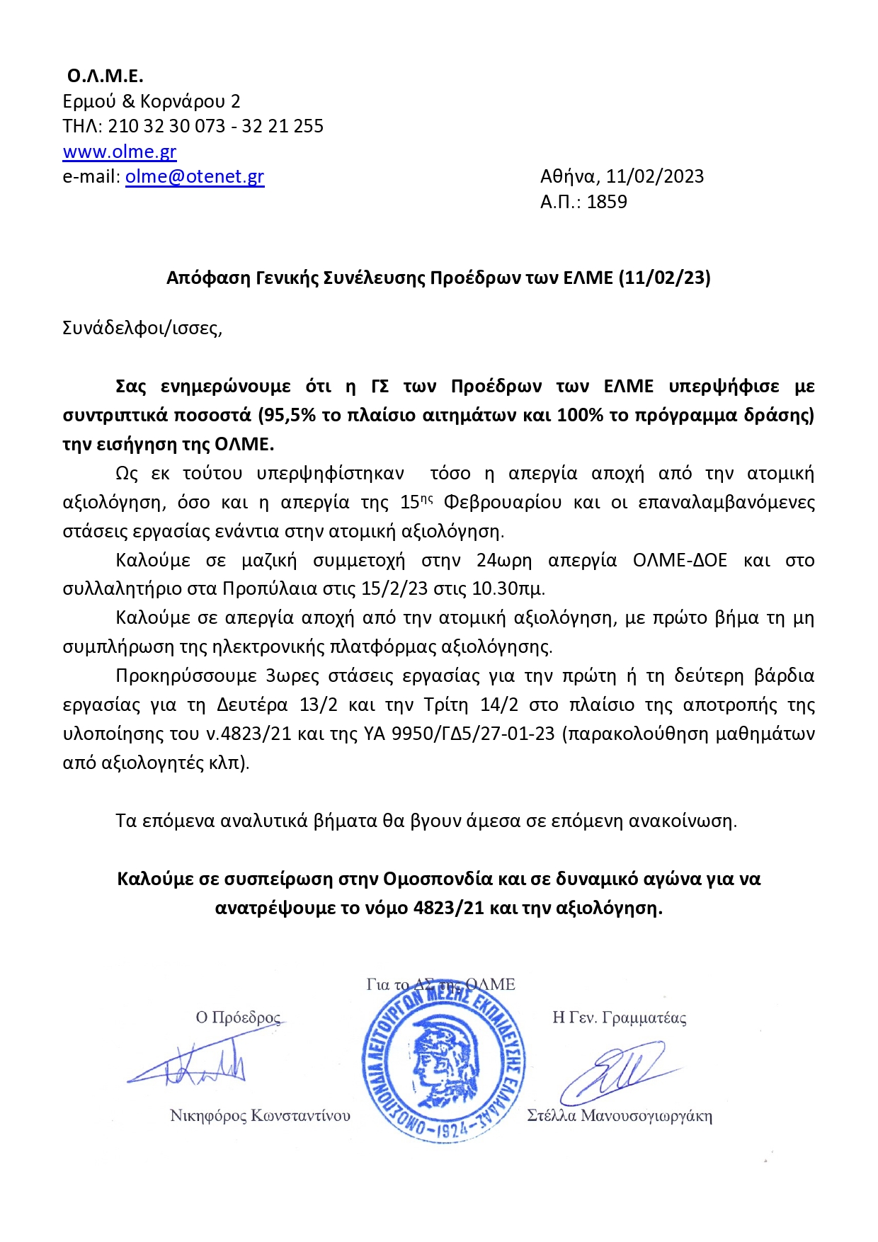 «Mε την απόφαση της ΓΣ συμμετέχουμε στην Ολομέλεια προέδρων της 13ης Φλεβάρη, καλώντας σε διεύρυνση του πλαισίου και των αγωνιστικών αποφάσεων του κλάδου στην κατεύθυνση του αγώνα μέχρι τη νίκη: