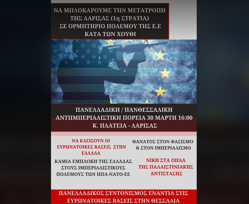 Καλούμε τους φοιτητές, τους εργαζόμενους, τους νέους και την τοπική κοινωνία της πόλης της Λάρισας, ολόκληρης της Θεσσαλίας και της Ελλάδας, στις 30 Μάρτη στις 16:00 σε πανελλαδικό – πανθεσσαλικό αντιιμπεριαλιστικό συλλαλητήριο, εκφράζοντας την αντίθεση μας στην εμπλοκή της Ελλάδας στους ιμπεριαλιστικούς πολέμους των ΗΠΑ-ΝΑΤΟ- ΕΕ και την μετατροπή της 1ης Στρατιάς σε ορμητήριο πολέμου της ΕΕ.