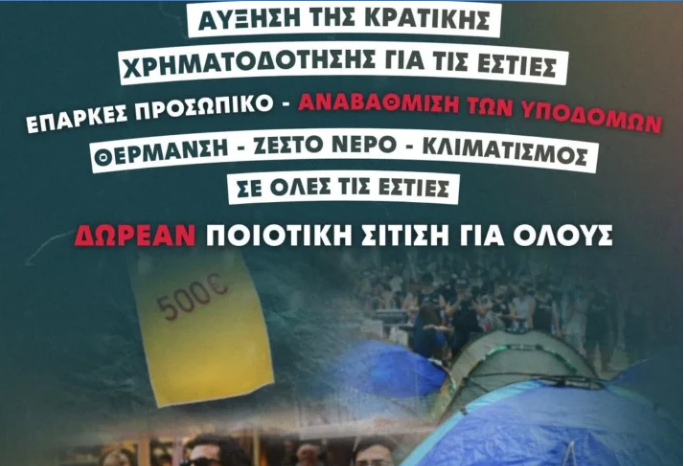 - Σίτιση, συντήρηση, φύλαξη και καθαριότητα στην ευθύνη του κράτους με πρόσληψη όλου του απαραίτητου μόνιμου προσωπικού, με όλα τα εργασιακά και ασφαλιστικά δικαιώματα. Έξω οι εργολάβοι από τις εστίες μας.