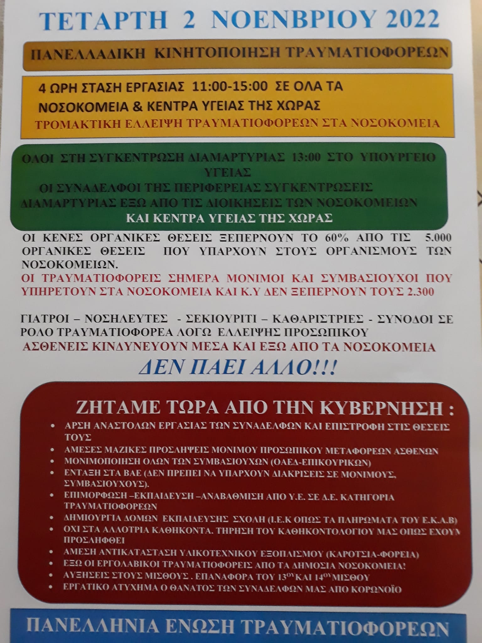 Η Πανελλήνια Ένωση των Τραυματιοφορέων καταγγέλλει στο κάλεσμά της ότι κενές οργανικές θέσεις ξεπερνούν το 60% με αποτέλεσμα εργαζόμενοι και ασθενείς να βρίσκονται σε κίνδυνο.