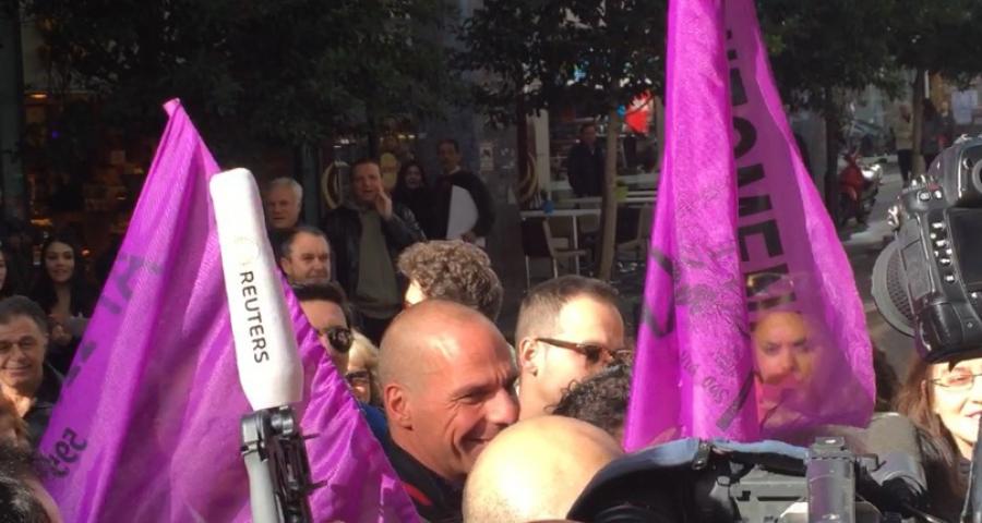 Ο Γιάννης Βαρουφάκης και η Νάντια Βαλαβάνη έγιναν δεκτοί με ενθουσιασμό από τις καθαρίστριες, οι οποίες πανηγύριζαν για την άφιξη του νέου επιτελείου.