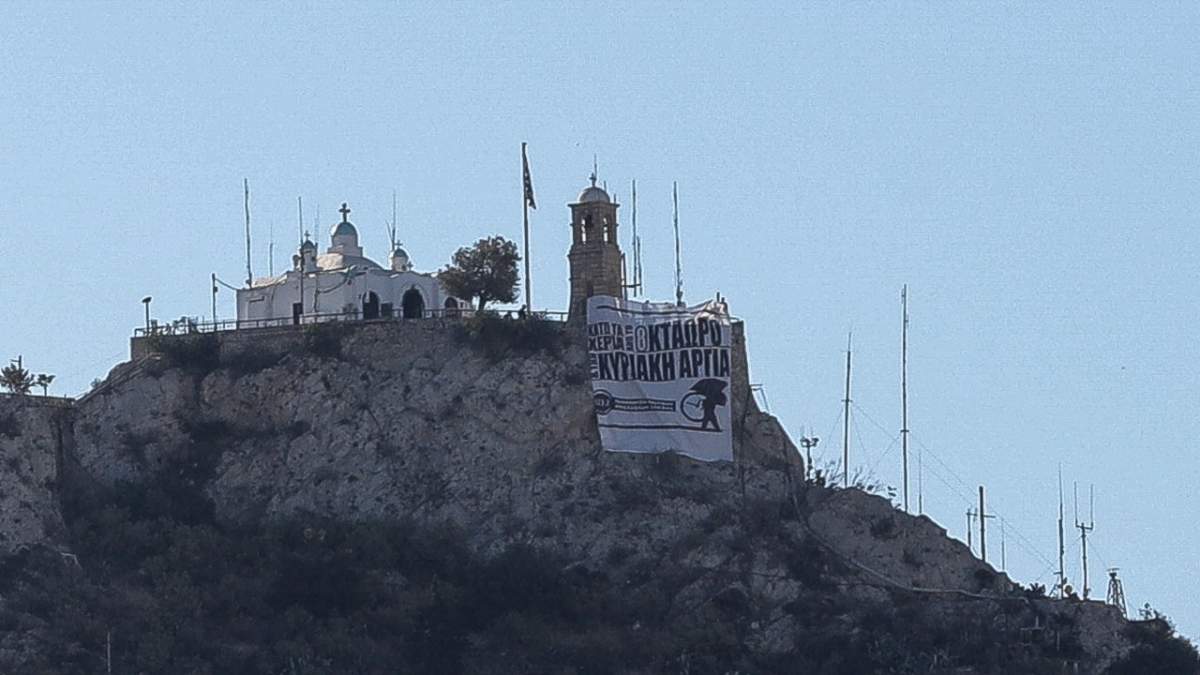Ένα τεράστιο πανό απλώθηκε σήμερα στον Λυκαβηττό δίνοντας στην Αθήνα το μήνυμα του αγώνα ενάντια στο αντεργατικό τερατούργημα, που προωθεί η κυβέρνηση με τη κατάργηση του 8ωρου, την κατάργηση της Κυριακής Αργίας. Ένα πανό ενάντια στο άνοιγμα των καταστημάτων όλες τις Κυριακές που προωθεί η κυβέρνηση και ο Υπουργός Ανάπτυξης, υλοποιώντας τις εντολές των μεγάλων εργοδοτών του λιανεμπορίου.