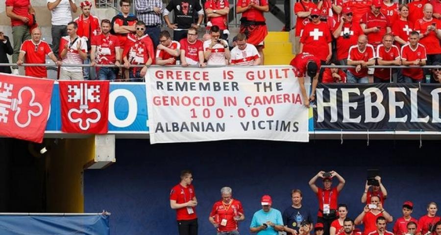 «Η Ελλάδα είναι ένοχη. Θυμηθείτε τη γενοκτονία της Τσαμουριάς. Εκατό χιλιάδες Αλβανοί θύματα», αναγραφόταν συγκεκριμένα στο πανό που σήκωσαν κάποιοι θερμοκέφαλοι Αλβανοί φίλαθλοι και λίγο πριν ο διαιτητής σφυρίξει το εναρκτήριο λάκτισμα για την αναμέτρηση της ομάδας της χώρας τους με εκείνη της Ελβετίας.