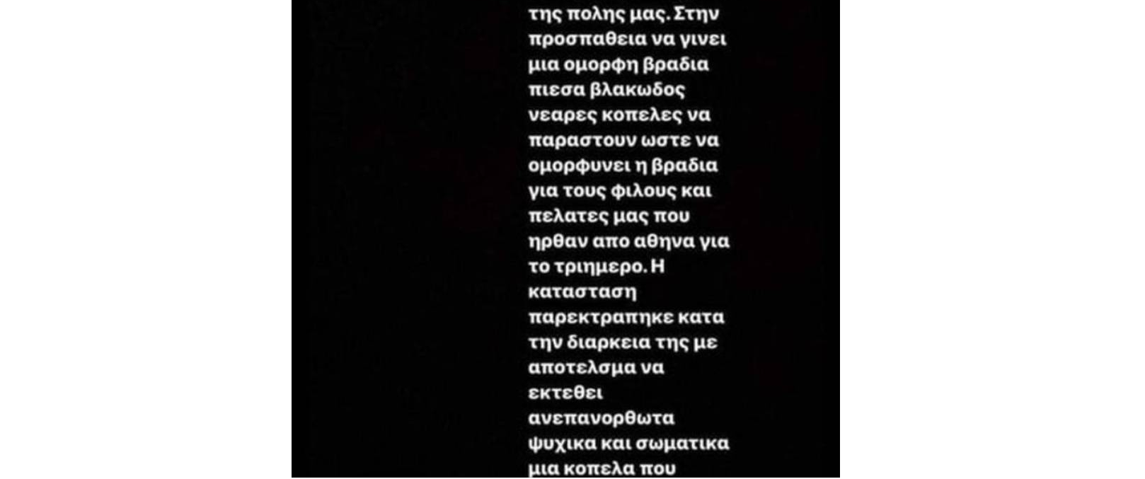«Την παραμονή της πρωτοχρονιάς διοργανώσαμε εγώ και οι συνεργάτες μου ένα πάρτι σε σουίτα γνωστού πεντάστερου ξενοδοχείου της πόλης μας. Στην προσπάθεια να γίνει μια όμορφη βραδιά, πίεσα βλακωδώς νεαρές κοπέλες να παραστούν ώστε να ομορφύνει η βραδιά για τους φίλους και πελάτες μας, που ήρθαν από την Αθήνα για το τριήμερο. Η κατάσταση παρεκτράπηκε κατά τη διάρκειά της νύχτας με αποτέλεσμα να εκτεθεί ανεπανόρθωτα ψυχικά και σωματικά μια κοπέλα που γνωρίζω και ήμουν σαφώς η πιεστική αιτία για να παραστεί στο πάρτι. Το λιγότερο που έχω να πω είναι ότι οφείλω ένα τεράστιο συγγνώμη», έγραψε στο Instagram ένας εκ των φερόμενων δραστών.