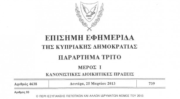 Το Sigmalive εξασφάλισε και παρουσιάζει το ένα από τα διατάγματα του Διοικητή της Κεντρικής Τράπεζας για τις επιμέρους πτυχές του Νόμου περί εξυγίανσης πιστωτικών ιδρυμάτων. Το συγκεκριμένο προκαλεί έντονες αντιδράσεις στην Τράπεζα Κύπρου, οι οποίες έχουν σηματοδοτηθεί ήδη από την παραίτηση του Προέδρου της Τράπεζας, Ανδρέα Αρτέμη.