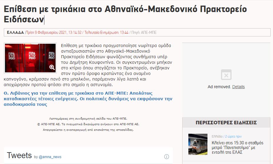 Μια μικρή ομάδα ατόμων το μεσημέρι της Τρίτης ανέβηκε στον 1ο όροφο του κτιρίου που στεγάζεται το ΑΠΕ-ΜΠΕ και αφού πέταξαν τρικάκια, σήκωσαν πανό στο μπαλκόνι για τον Δημήτρη Κουφοντίνα. Οι αλληλέγγυοι αποχώρησαν σε λίγα λεπτά «πρoτού φτάσει στο σημείο η αστυνομία», όπως αναφέρει το ΑΠΕ-ΜΠΕ στην είδηση του για την παρέμβαση στην οποία κάνει λόγο για «επίθεση με τρικάκια».