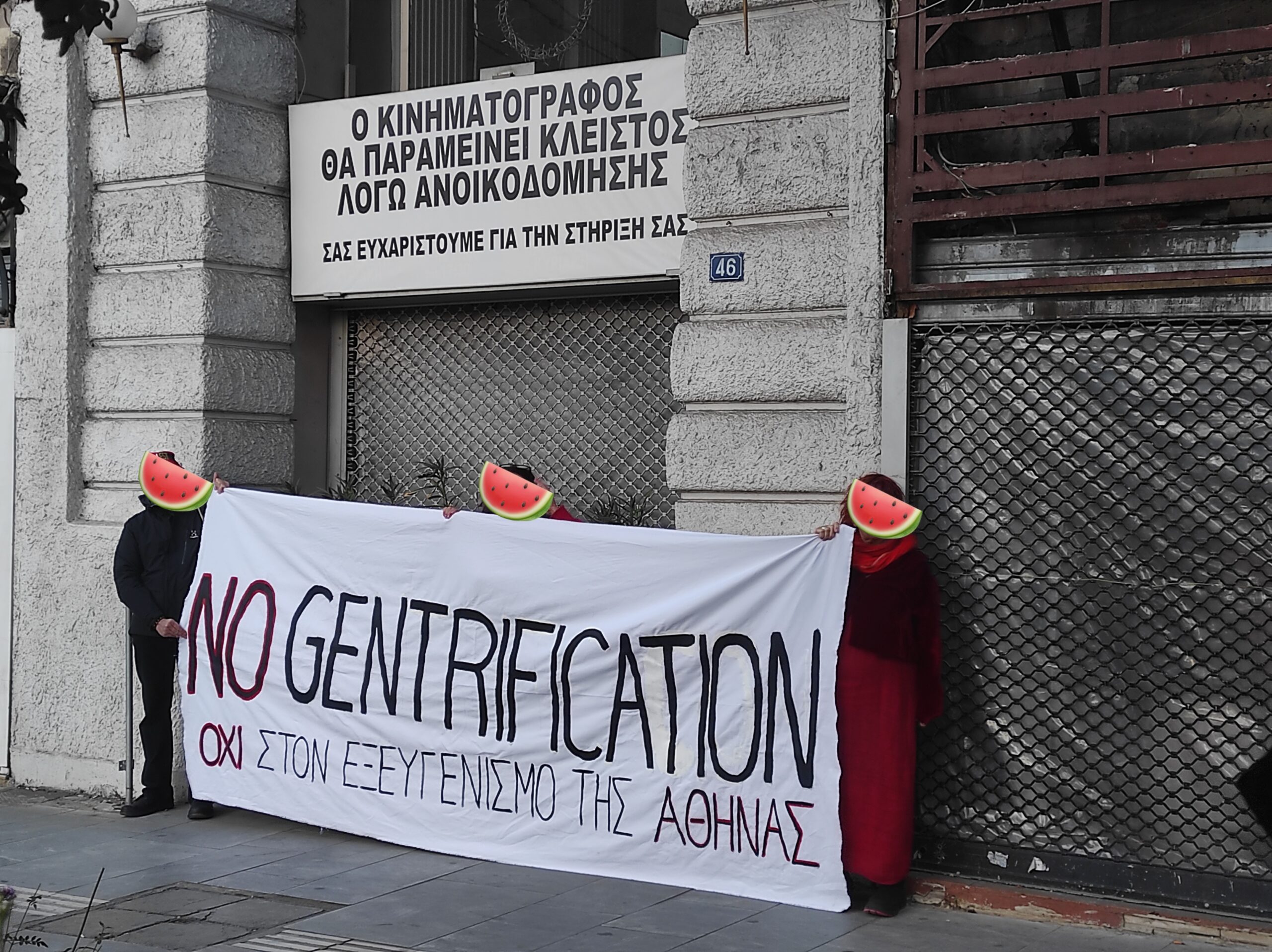 Το πανό ΝΟ Gentrification – ΟΧΙ στον “εξευγενισμό” της Αθήνας υπενθυμίζει ότι το κτίριο στο οποίο πραγματοποιείται η έκθεση προορίζεται από τον Όμιλο Μήτση να μετατραπεί σε πολυτελές ξενοδοχείο, καταστρέφοντας στο βωμό της τουριστικοποίησης μνήμες και πολιτισμό ενός ολόκληρου αιώνα αλλά και περιορίζοντας τον δημόσιο χαρακτήρα του κτιρίου. Στο κτήριο στεγαζόταν ο παλαιότερος Αθηναϊκός κινηματογράφος ΙΝΤΕΑΛ (102 χρόνων) που έχει κλείσει, παρά τις έντονες διαμαρτυρίες πολιτών, καλλιτεχνών, πνευματικών ανθρώπων οι οποίες αγνοήθηκαν προκλητικά από το Υπουργείο Πολιτισμού και από την παραπάνω εταιρεία που δεν προστάτεψαν τον ιστορικό κινηματογράφο».