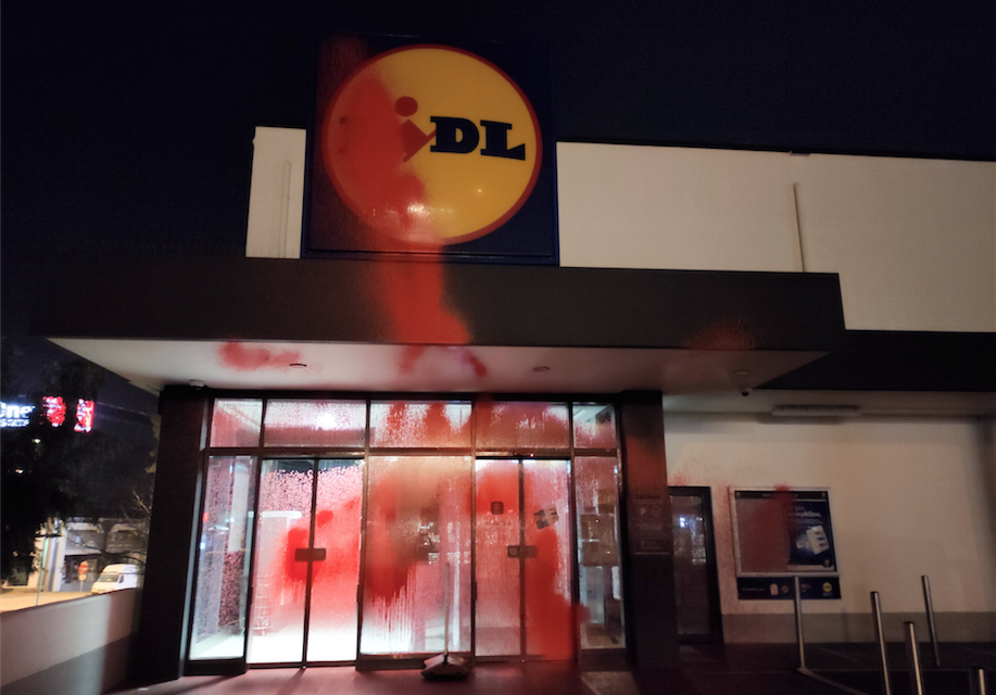 Η σημερινή μας ενέργεια, ως μια ελάχιστη συμβολική απάντηση σε όσα τραγικά συμβαίνουν, είναι αφιερωμένη σε έναν από αυτούς τους πολυεθνικούς κολοσσούς, τα Lidl. Συνεχείς καταγγελίες από πελάτες για προσφορές-κοροϊδία, κάκιστη ποιότητα προϊόντων, δήθεν top εργοδότης και δήθεν τρισευτυχισμένοι εργαζόμενοι στα διαφημιστικά φυλλάδια, τη στιγμή που στην πραγματικότητα, τους κάνουν τον βίο αβίωτο.