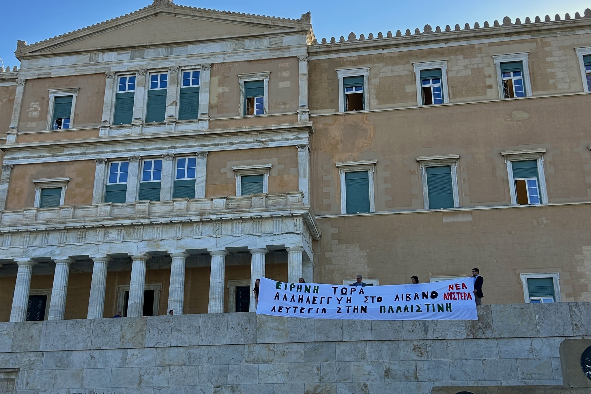 Σε παρέμβαση έξω από τη Βουλή προχώρησαν, σήμερα Τετάρτη, βουλευτές και βουλεύτριες της Νέας Αριστεράς, με ανάρτηση πανό το οποίο έγραφε: «Ειρήνη τώρα. Αλληλεγγύη στο Λίβανο. Λευτεριά στην Παλαιστίνη».